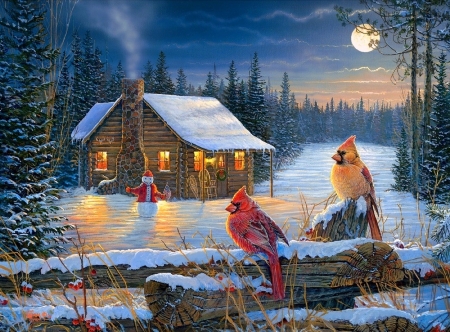 cabin winter moonlight christmas cardinals snowman desktop background cabins xmas snow paintings wallpapers nexus seasons